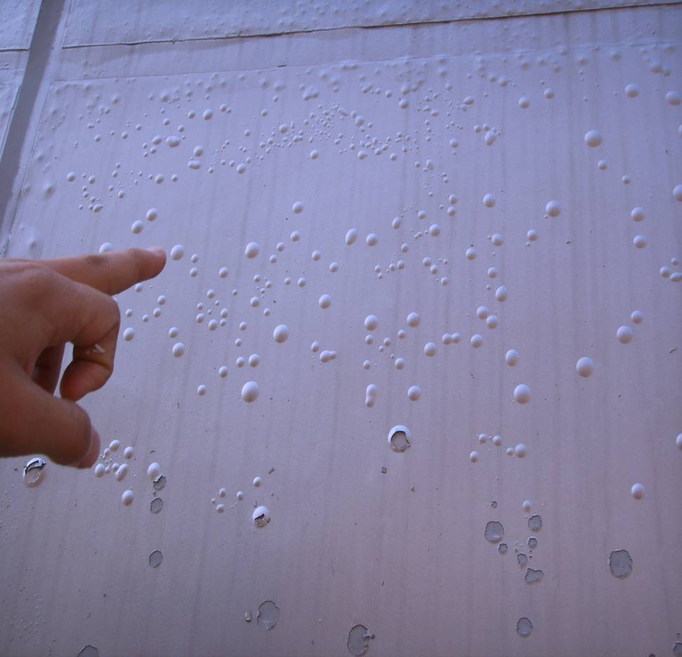 ★ 處理方法:用鏟刀將鼓起部位鏟除,清理干凈,用彈性膩?zhàn)舆M(jìn)行修補(bǔ),加強(qiáng)抗堿底漆進(jìn)行墻面批刮和修補(bǔ),更好是在選擇外墻膩?zhàn)訒r(shí)選擇正規(guī)的廠家,杜絕將松散的膩?zhàn)佑迷谕鈮γ妫駝t將會(huì)造成很多麻煩(如有一廠房工程,每刮一次臺(tái)風(fēng)我們都得去修補(bǔ)一次)。